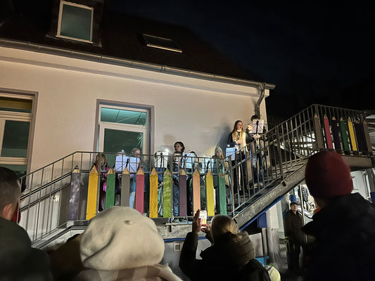 Da die Turnhalle in Rommersdorf, in der unsere jährliche Weihnachtsfeier in der Regel stattfindet, derzeit gesperrt ist, haben wir die Weihnachtsfeier auf unseren Schulhof verlegt. Unter dem bunt und weihnachtlich geschmückten Dach haben sich alle Klassen und auch viele Eltern am letzten Schultag vor den Ferien versammelt, um den Aufführungen einiger Klassen zu lauschen und gemeinsam Lieder zu singen.