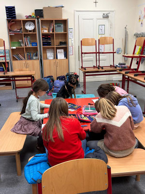 Schulhündin Luna begleitet Herrn Holzinger schon seit Beginn des Schuljahres 2022/23 an drei Tagen im Unterricht. Für die Kinder der Klassen 3a und 4a ist Luna zum festen Bestandteil des Schullebens geworden. Dabei bewegt sich Luna in der Regel frei in der Klasse, lässt sich streicheln oder lässt sich als Lesehund vorlesen. In einzelnen Stunden lernen die Kinder viele wichtige Dinge über den richtigen Umgang mit Hunden und lernen dabei unter anderem die Körpersprache der Hunde zu lesen.